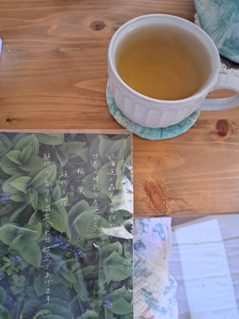 ローズブレンドは、ホーリーバジルやホーラーバジル、スペアミントなど数種類のハーブがブレンドされています。ローズが入っているので、見た目も美しいブレンドです。ローズは、モロッコ産ですがそれ以外のハーブはすべて北海道産。北海道産と記載があるものは、ほぼ白銀荘で育てているハーブとおっしゃっていました。