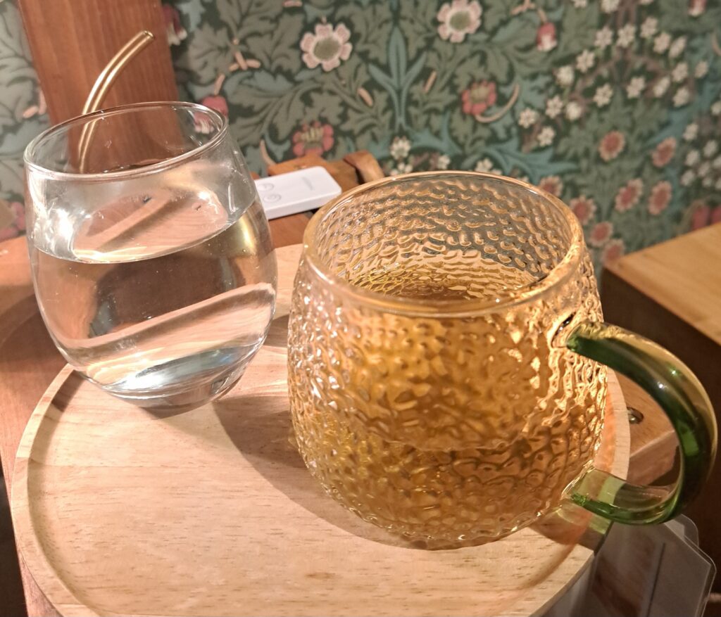 よもぎ蒸しをしてから、数分でじわりと汗をかいてきます。私は、代謝が悪いため暑い日も汗をかけない体質ですが、よもぎ蒸しをするとたくさん汗をかきます。よもぎ蒸しでかく汗は、べっとりしていなくて水のようにサラサラしているんです。このさらっとした汗は「皮脂腺」からの汗で、老廃物や皮脂を排出します。デトックス効果やお肌の調子を整えてくれます。こまめに水分補給をして、デトックスを促しましょう。私が行っているサロンでは、冷たいお水と季節のハーブティーをサービスしてくださり、こまめにおかわりも注ぎにきてくれます。8月のティーはよもぎ茶をいただきました。ちなみに前回はバタフライピーティーでした。店内の天井にはグリーンが装飾されていて、居心地がよくゆったり過ごせる空間です。40分のよもぎ蒸しは、いつもあっという間に終わってしまいます。