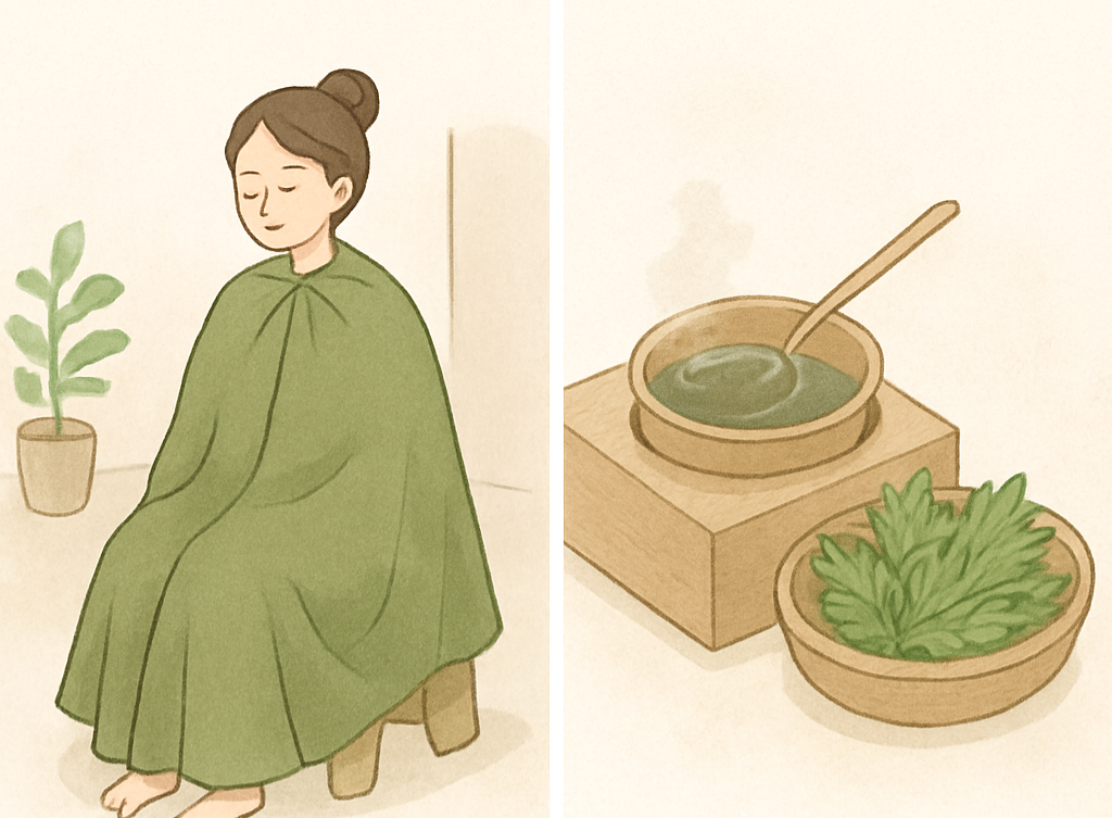 【よもぎ蒸し】は、韓国で数百年以上前に始まった民間療法です。世界の三大美女の楊貴妃も受けていたと言われています。よもぎを煮出した蒸気を膣を中心に全身へ吸収させて、身体を温めます。韓国で、女性の健康維持や産後の回復のために取り入れられていました。サロンで行うよもぎ蒸しは、専用のマントを被り、穴の空いた椅子に座り行います。椅子の下でよもぎを煎じ、その蒸気を全身に吸収することができます。