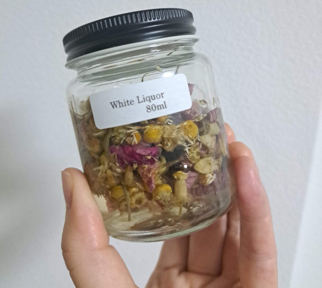チンキとは、ハーブをアルコールに漬けてつくる濃縮液のことです。水からは抽出できない植物の有効成分(油溶性の有効成分)がアルコールに溶け出すので、ハーブの力を効率よく摂取できます。長期保存もできるので、1度仕込んでおけば、半年〜2年ほど持ちます。化粧水作り以外にも、マウスウォッシュや入浴剤など使い道はたくさんあります。