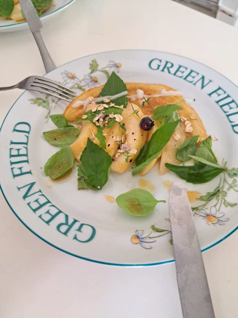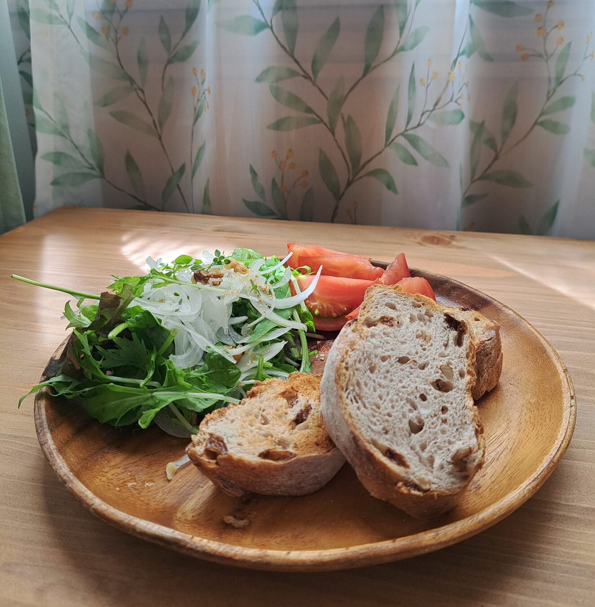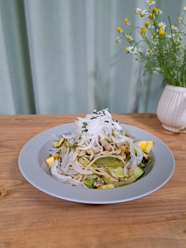 - 塩胡椒、醤油で味を整える。トッピングのスライス玉ねぎとタイムを添えて完成。